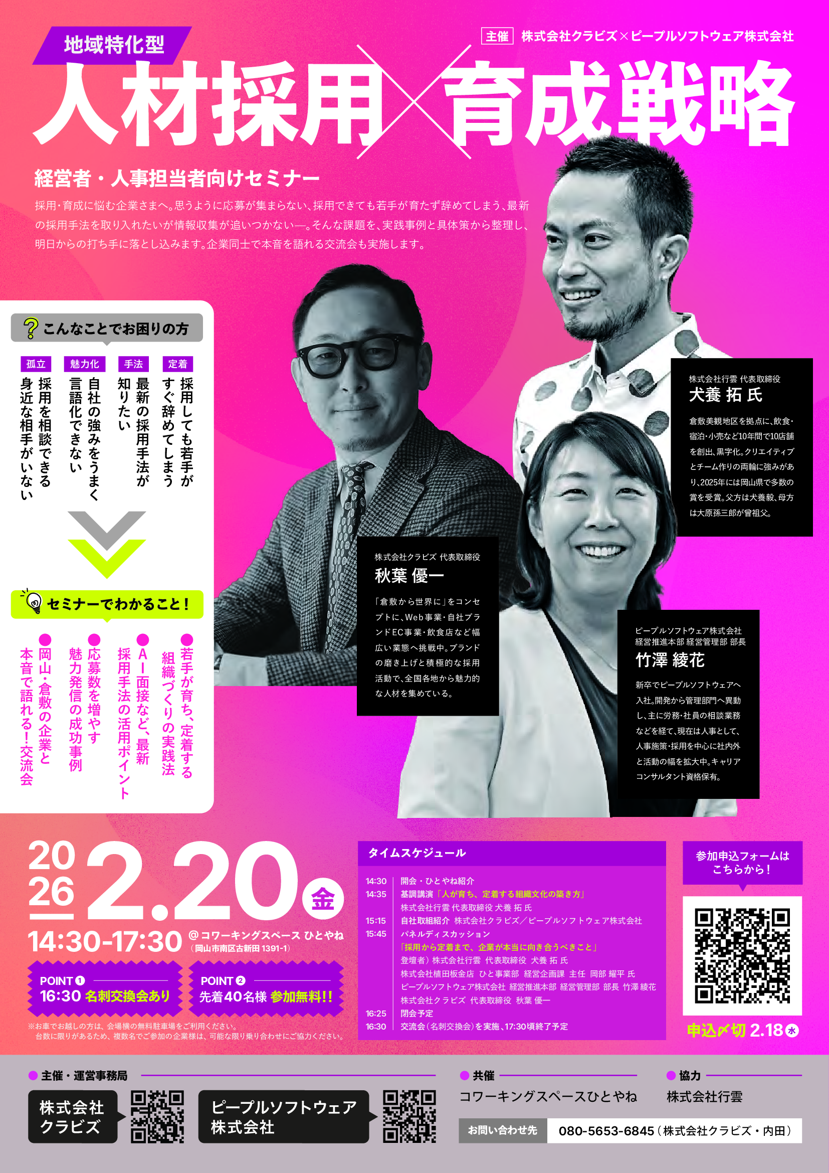 このたび、ピープルソフトウェア株式会社と共同主催で、岡山・倉敷の企業経営者・人事担当者さまを対象とした【人材採用×育成戦略セミナー&交流会】を開催いたします。